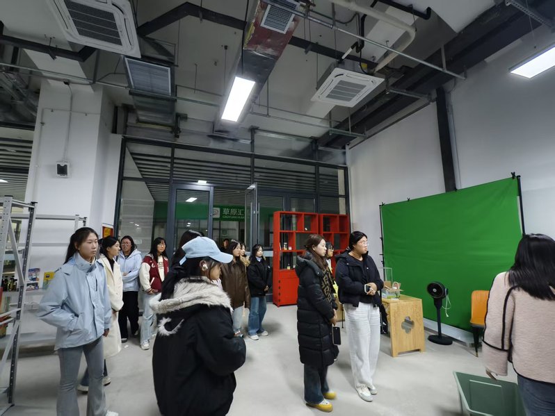 在公司电商负责人的引导下,师生一行走进均淑科技电商直播中心,明亮的多场景直播间内,专业灯光、高清摄像头、绿幕虚拟背景等设备一应俱全。负责人详细讲解了直播规则及团队的分工协作模式:“从选品、脚本策划、主播培训,到直播执行、售后复盘,每个环节都需精准衔接,尤其要结合地域特色挖掘产品卖点,才能打动消费者。”